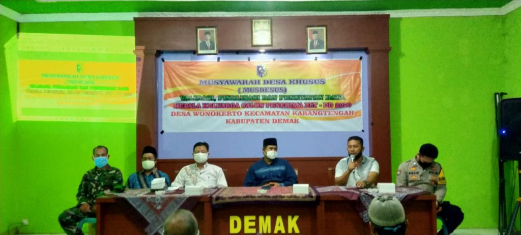 Kegiatan ini dihadiri oleh Kepala Desa Wonokerto Bambang Untoro, Sekdes Wonokerto Siswanto beserta Perangkat Desa, Banbinsa, Babinkamtibmas. Musdesus ini membahas Validasi, Finalisasi dan Penetapan Data Kepala Keluarga Calon Penerima Bantuan Langsung Tunai Dana Desa (BLT-DD) Tahun 2020 Desa Wonokerto Kecamatan Karangtengah.